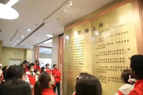 参观完纪念馆后,志愿者们还为留学生同学赠送了雷锋文创礼品,并一起进行了签名活动,倡议把雷锋精神代代传承下去,激励新时代青年向雷锋同志学习,积极奉献,热心公益,乐于助人,见义勇为,尽职尽责,艰苦奋斗。之后,外国语学院本科生翻译党支部全体党员来到雷锋同志的雕像前重温入党誓词,回顾自己的入党初心,不忘来时的路。
