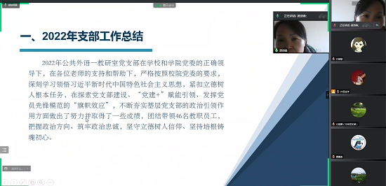 为进一步推进教职工党支部标准化、规范化建设,切实提升党支部的政治功能,12月13日下午,学院党委以腾讯线上会议的方式,开展2022年度教职工党支部书记“双述双评”工作考核。段胜峰院长主持会议,学院党政班子成员、教工支部全体委员参加会议。