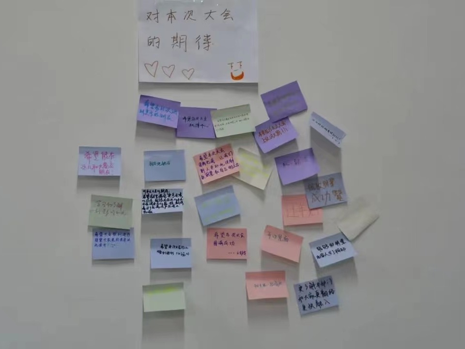 进入会议室,首先引人注目的是墙上张贴的便签,这些便签上写了成员们对于朋辈和本次大会的期望。在完成签到后,新成员们挑选了自己喜欢的便签和卡片,出乎意料的是前辈们还为实习干事们准备的小礼物,这别出心裁的设计让新成员们初步感受到了朋辈大家庭温暖的氛围。