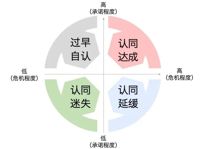 心理学家Marcia根据“过去的危机"与”现在的承诺”两个维度将人们对于“自我认同这个重大人生任务的完成情况详细分成了四种不同的状态:过早自认、认同迷失、认同达成与认同延缓。