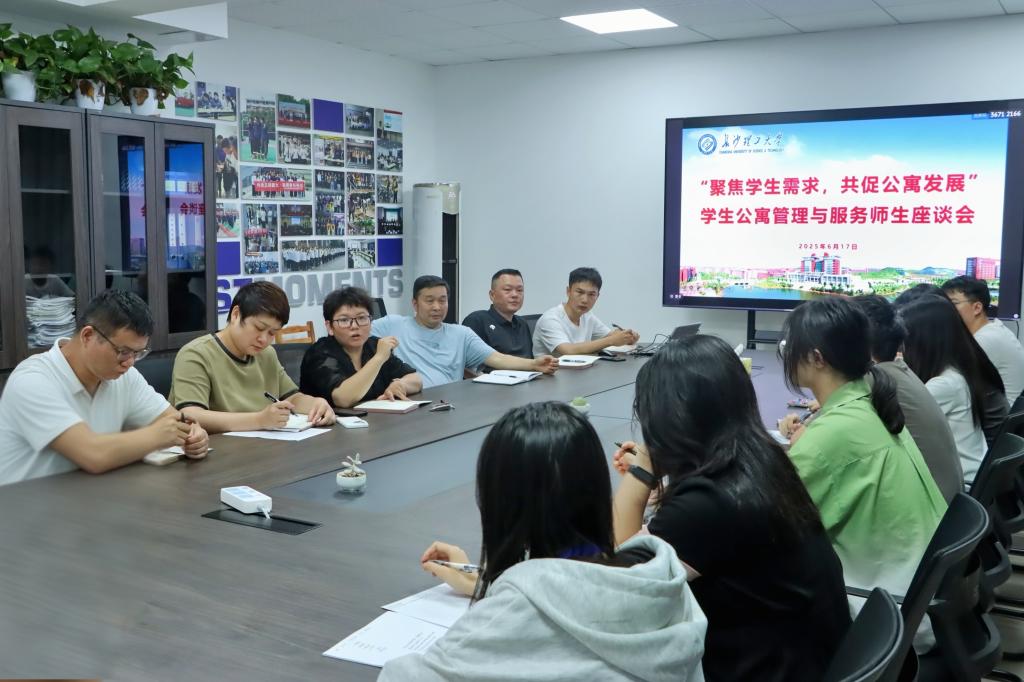 座谈会聚焦学生关切的学生社区保洁、水电维修等急难愁盼问题。郭梅首先结合社区、园区管理服务中的典型案例,深入剖析了当前工作中的重点与难点,引导与会师生展开深入讨论。学生代表们结合自身生活体验,围绕生活服务保障、公寓日常管理、安全设施与基础建设、环境优化提升等方面,积极建言献策,提出了多项富有建设性的意见与建议。与会老师认真倾听、逐条记录,并就维修服务时效、宿舍环境改善、劳动教育实践区域整改等具体问题,进行了现场回应与解答,会议氛围务实高效。