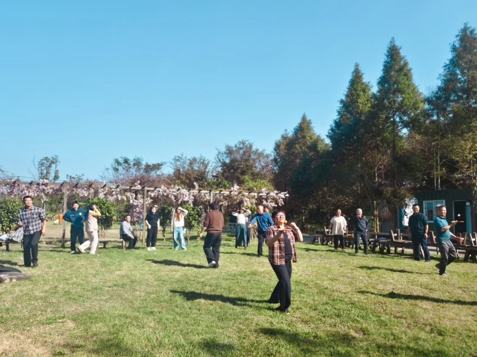 比赛结束后为职工们自由活动时间,大家饶有兴趣地在湖边围炉煮茶、游园拍照,在山清水秀的大自然中充分放松心情。