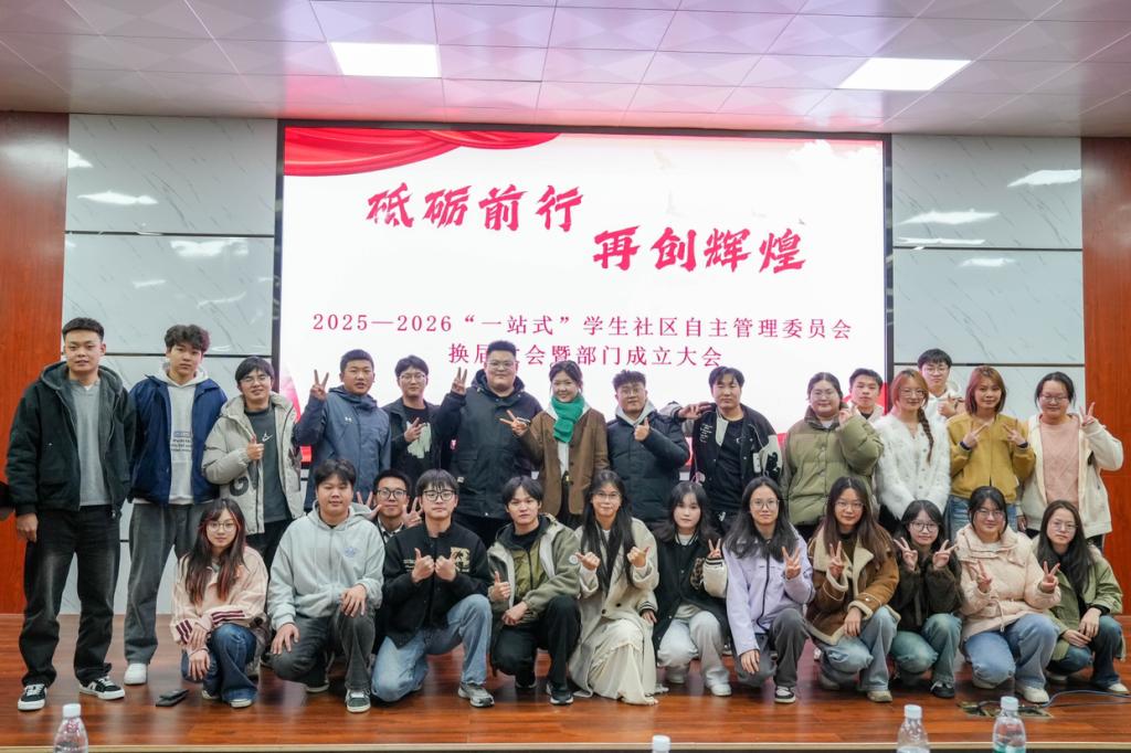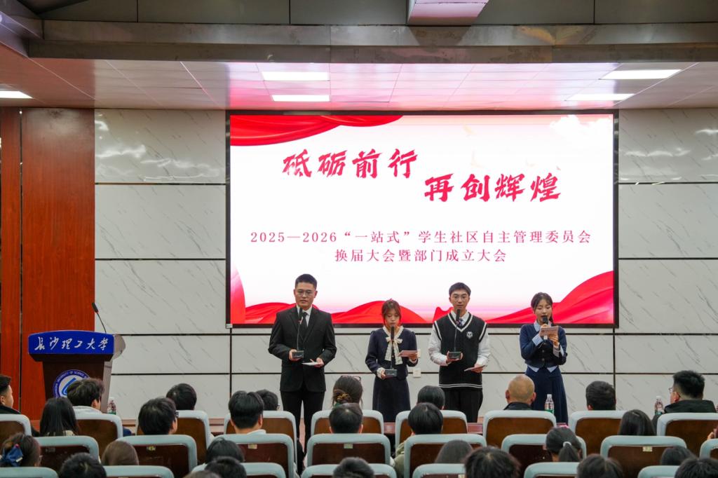 为加强学生工作部公寓管理服务中心组织建设,凝聚学生力量助推学生社区发展,2025-2026学年“一站式”学生社区自主管理委员会换届大会暨部门成立大会于11月21日18:30在金盆岭校区四教报告厅举行。金盆岭校区宿管办主任龙军、朱虹老师,2024—2025届委员会主席团及新一届全体成员参会。