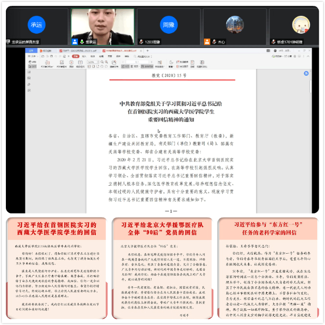 会上,龙承运带领学生党员和入党积极分子重温了习近平总书记在纪念五四运动 100 周年大会上的讲话精神,重点回顾了习近平总书记对新时代中国青年提出的“树立远大理想”“热爱伟大祖国”“担当时代责任”“勇于砥砺奋斗”“练就过硬本领”“锤炼品德修为”六点要求。结合这六点要求,全体参会人员再重点学习领悟“习近平给在首钢医院实习的西藏大学医学院学生的回信”、“习近平给北京大学援鄂医疗队全体‘90后’党员的回信”以及“习近平给参与‘东方红一号’任务的老科学家的回信”中的深刻内涵和重要意义,龙承运结合疫情防控一线青年工作者的先进事迹及其涌现出的无私无畏精神,教导支部全体同学一定要树立真挚的为民情怀、锻造过硬的意志品质、练就超强的工作本领,勇于在党和人民最需要的地方绽放青春。