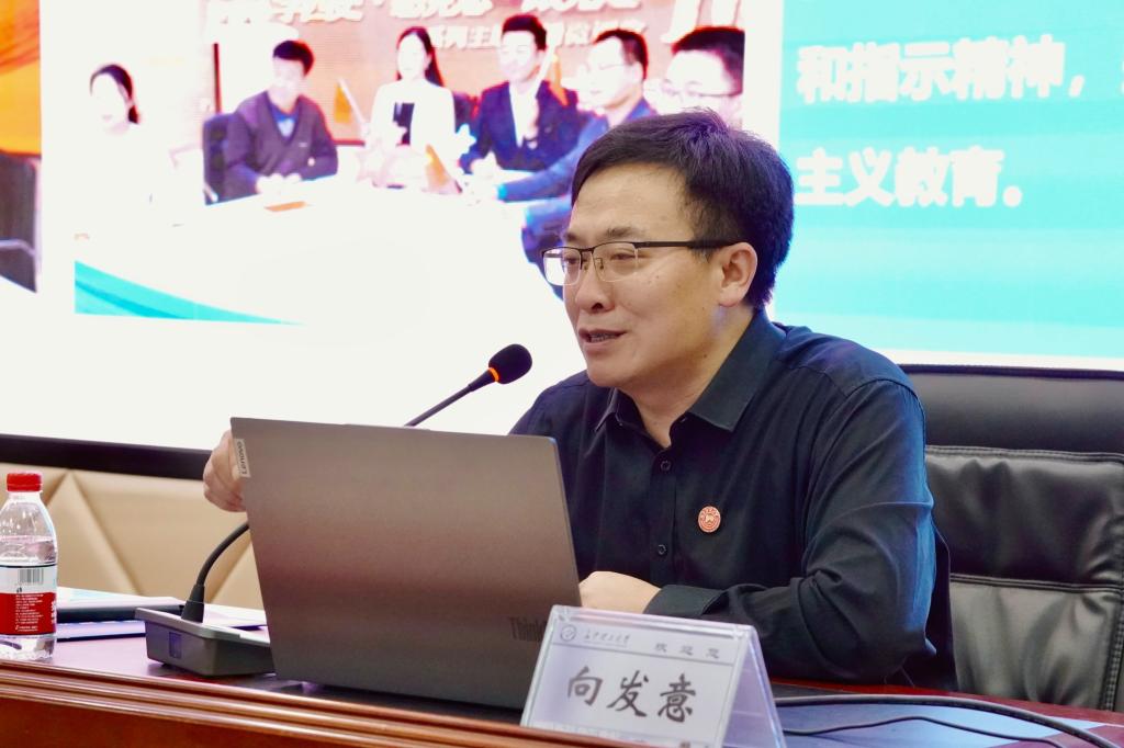 4月17日上午,湖南师范大学学生工作部部长向发意为2022年湖南省高校二级院(系)党委(总支)副书记高级研修班学员讲授《坚持培根铸魂 培育时代新人——从湖南师大育人实践漫谈高校学工队伍成长路径》专题报告。报告由湖南师范大学新闻与传播学院党委副书记张小春主持。