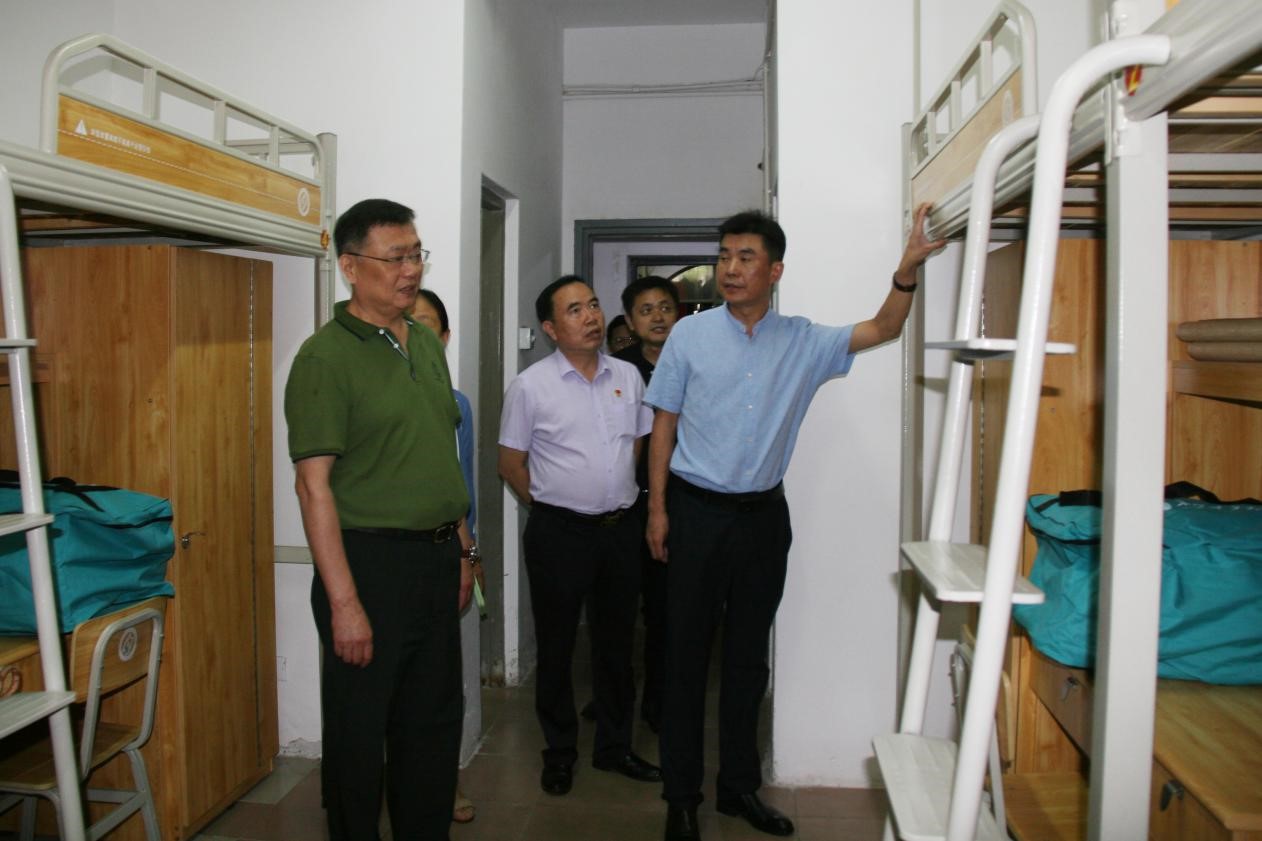 谈传生一行检查了金盆岭校区校门口学生入校通道的布置、大门开放、车辆进校引导及停车方案;深入宿舍了解学生学习、生活及公共区域场所的卫生、消杀情况;沿路查看新生报到路线设置、指示牌设置情况,并强调主要路口指示标志一定要醒目;仔细检查寝室床上用品及生活设施准备情况,了解宿舍管理制度及新生养成教育方案,强调学生宿舍是养成教育和推进“三全育人”工作的重要阵地,务必要抓实抓牢。