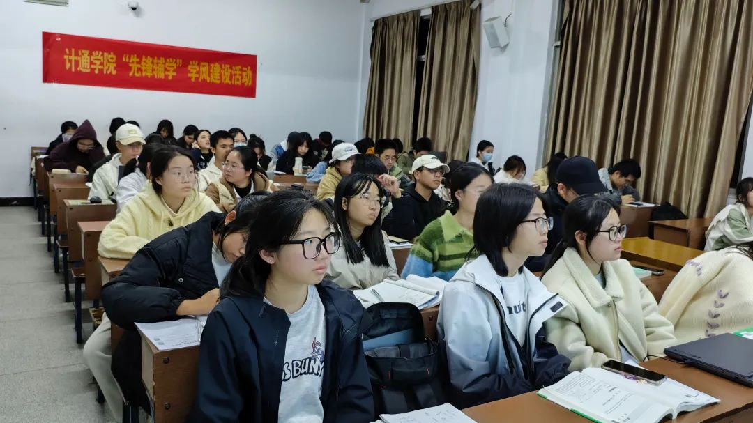11月28日晚,计通学院于金盆岭校区十二号教学楼106教室举办第十期“先锋辅学”学风建设活动,此次活动由软件2303班杨嘉雯与网络2301班谭鑫共同主讲,共计49位学员参与。