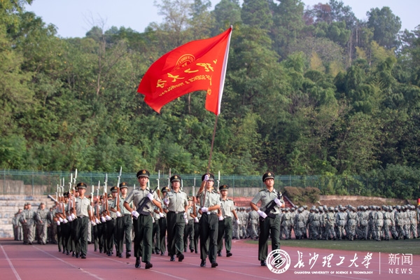 在庄严肃穆的氛围中,全体参会人员向冉冉升起的国旗行注目礼,共唱国歌。随后,气势恢宏的红旗舞、破锋八刀、匕首操等特色方阵依次上场,同学们高呼“正义必胜 和平必胜”。现场红旗招展,掌声雷鸣,经久不息。伴随着慷慨激昂的《分列式进行曲》,来自22个学院的142支新生方队昂首阔步通过主席台,他们军姿挺拔、士气高昂、目光如炬,充分展现了军训的扎实成果,展现出新时代大学生朝气蓬勃的精神风貌。