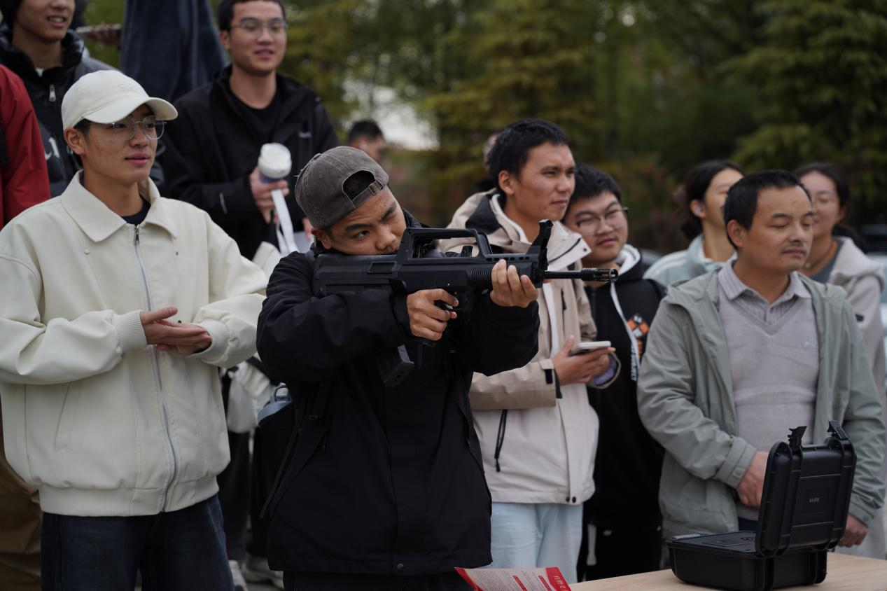 宣讲环节结束后,现场同学前往征兵主题展区参观,并参与仿真枪射击体验活动,沉浸式感受国防教育氛围。