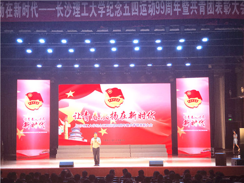 大会对2017-2018年度获得“全国活力团支部”、“全国最具影响力社团联合会”、“湖南省百优社团”和学校“红旗团委”、“红旗团支部”、“青年五四奖章”、“十佳团学干部”、“十佳团支书”等荣誉称号的先进集体和个人进行了表彰。表彰大会以音诗画《一封家书》拉开了序幕,带我们重温了炮火纷飞的年代里那催人泪下的一封封抗战家书;十佳团支书带来的《我的支部我的团》让同学们感受到基层团支部负责人的奉献精神;舞蹈《芳华》带我们回到了那个挥洒热血的时代;《不忘初心,逐梦前行》展示了艺术学院产品1503团支部扎实学习、勤奋创造的精神风貌;《我们是长理人》由校院两级学生会主席抒发了长理青年为祖国干事创业的雄心壮志;“长理青年”宣誓仪式,让每一个长理青年深感共鸣,激发出强烈的爱国爱校情怀;话剧《此时此刻》表达了长理校友在祖国南海挥洒汗水、为祖国负重前行的心声。大会在全场合唱《我爱你,中国》歌声中结束。