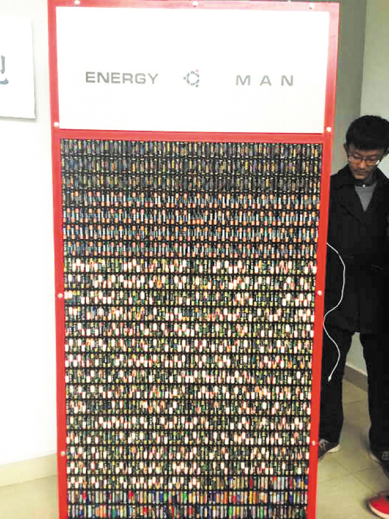 有谁见过可以为140部智能手机同时充电的超级充电器?大二女生谢妍回答道,“我们就有。”昨日,记者在XK星空云塘校区见到这个体积庞大的“大家伙”——Energy Man,和它的发明者聂翔、谢妍、汤静等人。走进工作室的时候,这群95后的大学生们还在往这个“大家伙”身上安装电池。这个巨型的电能再利用装置,长2米,宽1米,高0.2米。它上面装有300个电池格,每个电池格可以安装5节电池,所以这个“大家伙”身上一共有1500节电池,而这些电池全部都来源于生活中的废旧电池。