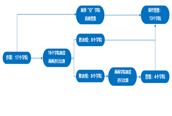 17个学院抽签两两比赛,抽到“空”的学院直接晋级决赛。A、B、C三组一一对决,均以限定时间内成功跳跃次数为标准,A、B、C三队中两队获胜的学院进入校级决赛。在预赛中失败的8个学院则再次抽签对决,胜利的学院进入校级决赛。共计13个学院进入校级决赛。