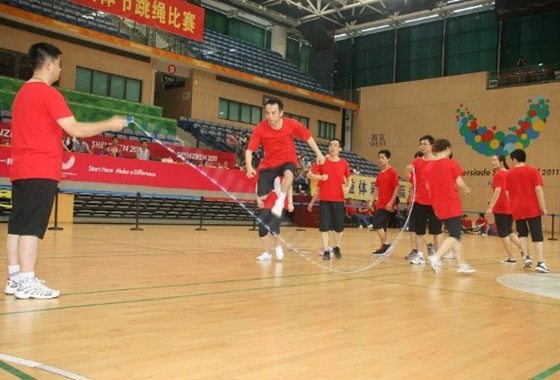 A组(十人集体跳):12人为一队进行集体跳绳。2名摇绳运动员,10名参跳运动员(5男5女)站在跳绳一侧,时间限制3分钟,统计3分钟内全员跳绳成功次数。
