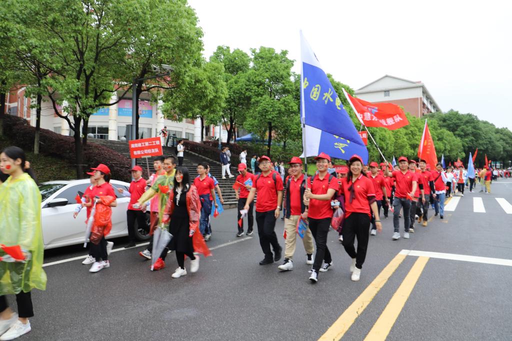 活动现场有一支支身着红衣的队伍,这是由国网湖南省电力公司、湖南省高速公路集团有限公司、湖南省交通水利建设集团有限公司、湖南澧水流域水利水电开发有限责任公司等多家单位、长沙校友组成的校友代表队。