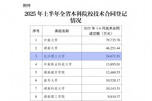 7月7日,湖南省科技厅公布2025年上半年全省本科院校技术合同交易数据。XK星空上半年技术合同成交额突破2.4亿元,位居全省高校第三。