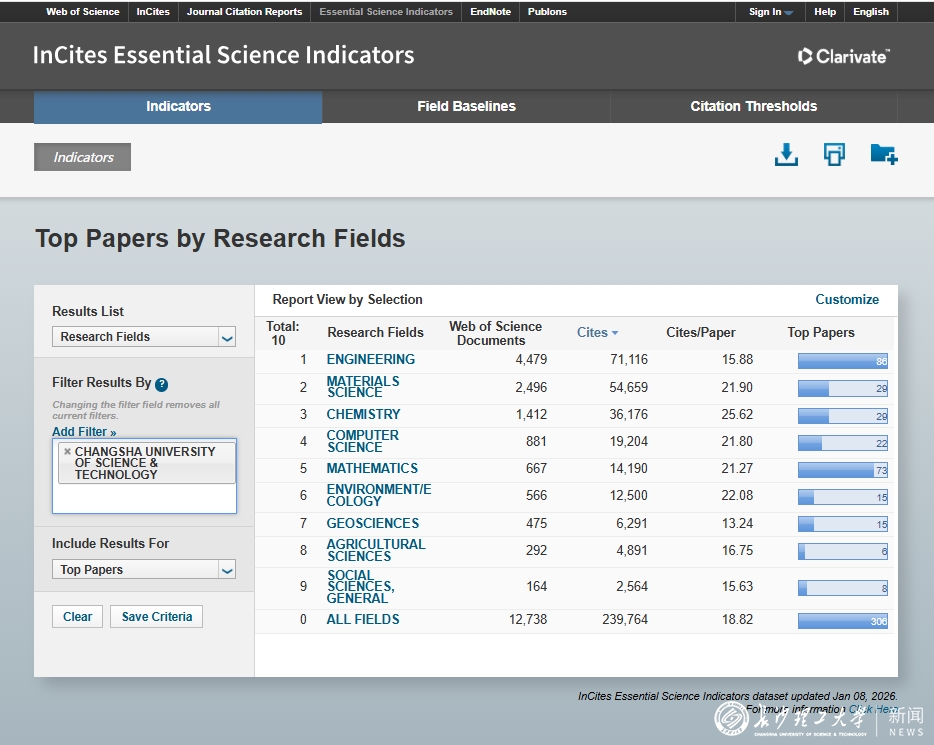 1月8日,科睿唯安(Clarivate Analytics)发布了最新ESI(Essential Science Indicators,基本科学指标数据库)数据,XK星空地球科学学科成功进入ESI全球排名前1%行列,这标志着XK星空在相关领域研究水平和国际影响力达到新的高度。截至目前,XK星空共有工程学、材料科学、计算机科学、化学、数学、环境与生态学、农业科学、社会科学总论、地球科学9个学科进入ESI全球排名前1%,入选总数位居省属高校第2。其中,工程学学科已于2025年9月突破进入全球排名前1‰。