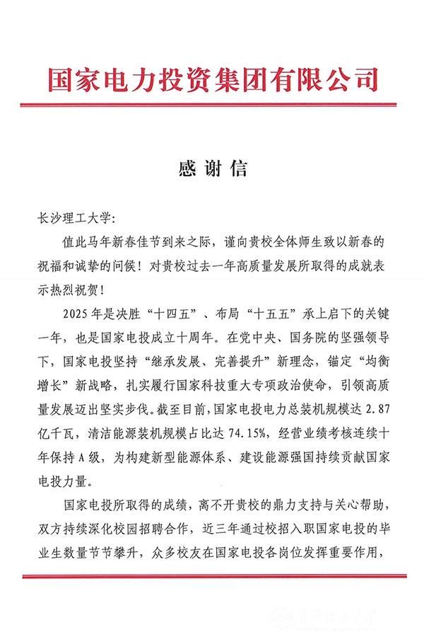 感谢信提到,2025年是决胜“十四五”、布局“十五五”承上启下的关键之年,也是国家电投成立十周年。过去一年,国家电投锚定“均衡增长”战略,扎实推进国家科技重大专项,高质量发展取得显著进展。近年来,校企双方合作不断深化,近三年通过校招入职国家电投的毕业生数量持续攀升。众多长理校友扎根企业各条战线,充分发挥专业优势,勇担发展重任,已成为推动企业发展的中坚力量。