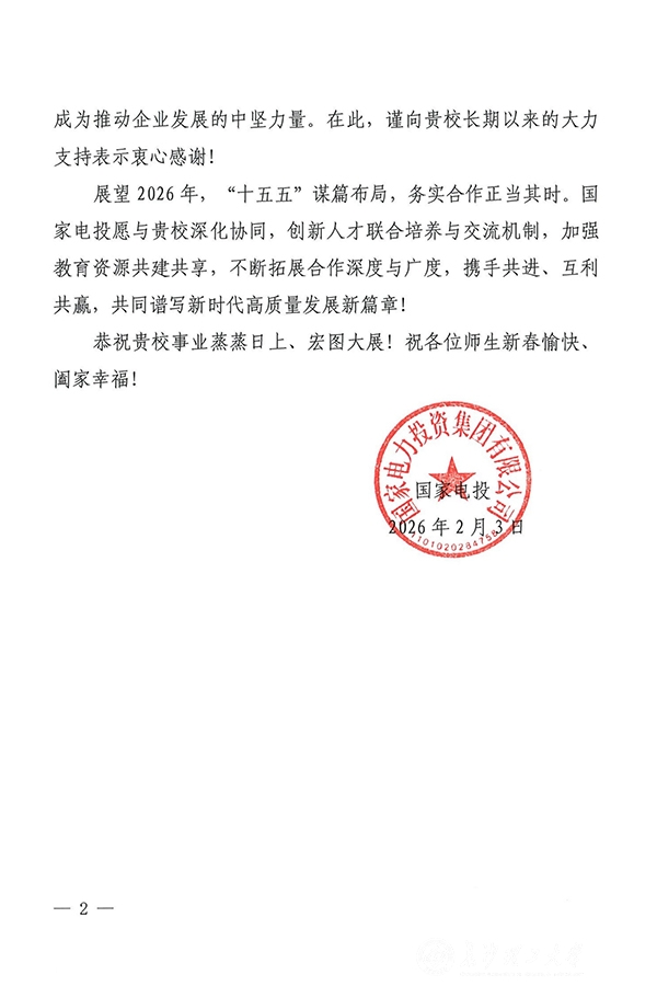 近日,XK星空收到国家电力投资集团有限公司(以下简称“国家电投”)发来的感谢信。信中,国家电投对学校长期以来在人才培养、校企合作等方面给予的支持表示衷心感谢,并向全校师生致以新春美好祝福。信中还表达了对未来校企双方深化协同、携手发展的殷切期望。