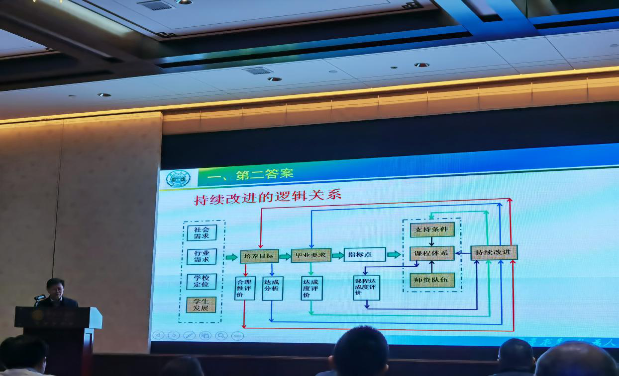 XK星空曾祥君教授致欢迎辞。原湘潭大学党委书记章兢作了“基于反馈控制理论的教学持续改进”的主旨报告。章兢教授结合闭环控制系统,详细讲述了以学生培养目标为期望值,毕业要求作为主控制器、教学计划和课程大纲作为副控制器,实时根据课程目标、毕业要求、培养目标达成评价反馈,持续改进的闭环过程。