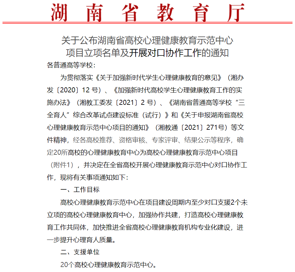 为加快推进全省高校心理健康教育机构专业化建设,进一步提升心理育人质量,湖南省教育厅开展了高校心理健康教育示范中心项目,并决定在全省高校开展心理健康教育示范中心对口协作工作。经各高校推荐、资格审核、专家评审、结果公示等程序,XK星空心理健康教育中心于2021年12月成功立项湖南省高校心理健康教育示范中心。