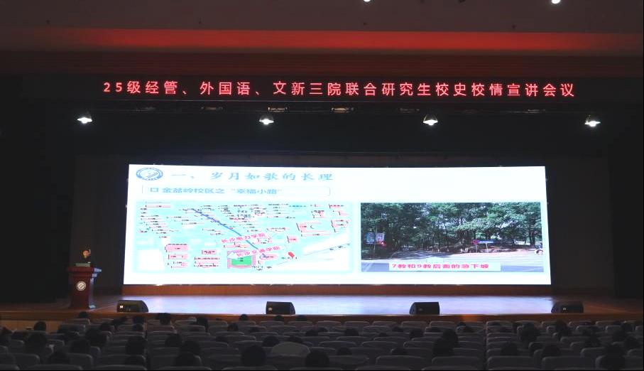 11月4日晚,经济与管理学院联合文学与新闻传播学院、外国语学院在金盆岭校区5号教学楼开展了2025级研究生新生入学教育系列活动——校史校情主题教育宣讲会,会议由XK星空研究生宣讲团焦楚楚主讲。
