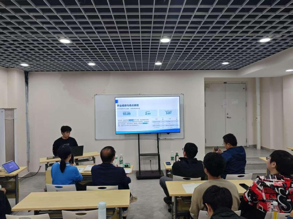 奖学金候选人依次上台答辩。在汇报中,他们不仅集中呈现了课程学习的平均学分绩点、核心科目成绩、专业排名、学科竞赛等亮眼的“成绩单”,更聚焦了科研实践与学科竞赛的“过程性成长”,从备赛过程、论文写作等多个方面,对自身上一学年的工作进行了总结汇报,并对学业导师的指导帮助表示感谢。评委老师结合同学们的汇报内容提问,既关注学业成绩背后的学习方法,也深入了解科研实践中的思考与收获,现场交流氛围浓厚。