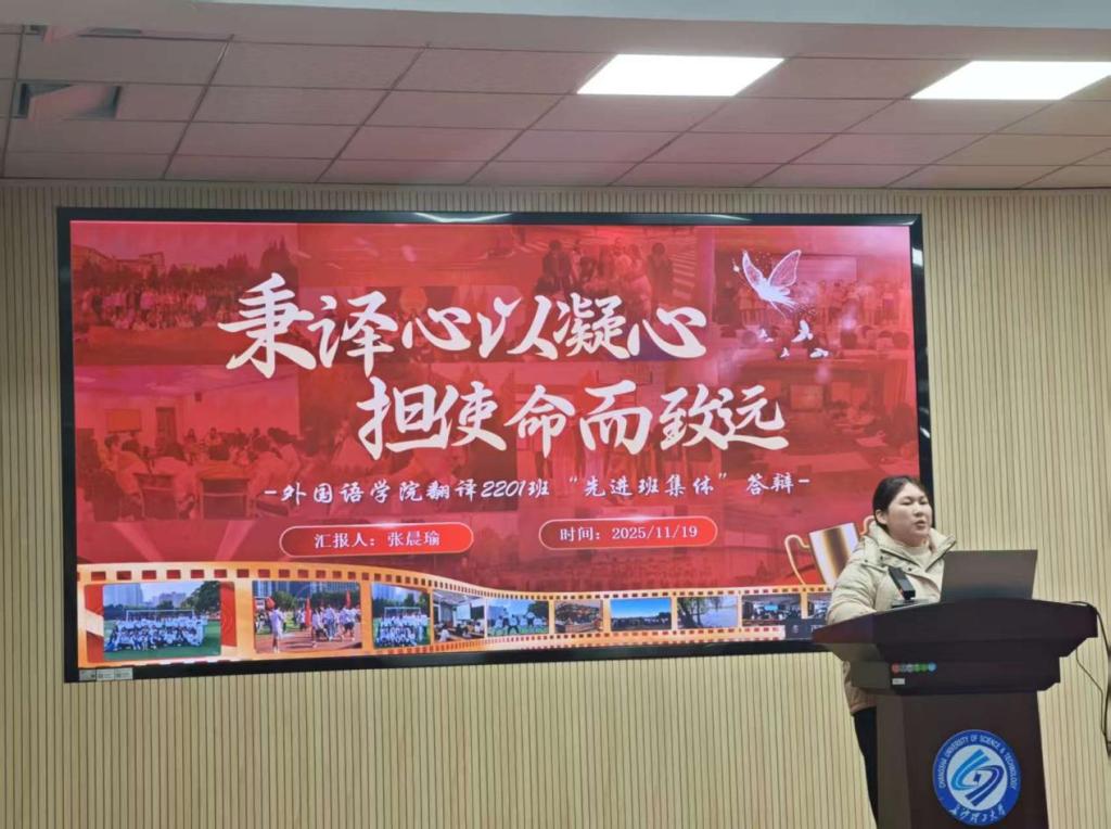 11月19日晚,外国语学院于金盆岭校区3号教学楼229教室组织开展2025-2026学年先进班集体验收评比大会。本次大会由办公室干事李梦谣主持,辅导员毛婕、学院团委学生会办公室全体成员及2022级至2025级全体班长参会。