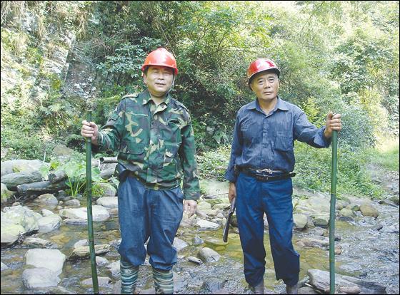 图为李文健(左)在湖南攸县与当地村支书野外考察石蛙生长环境 |