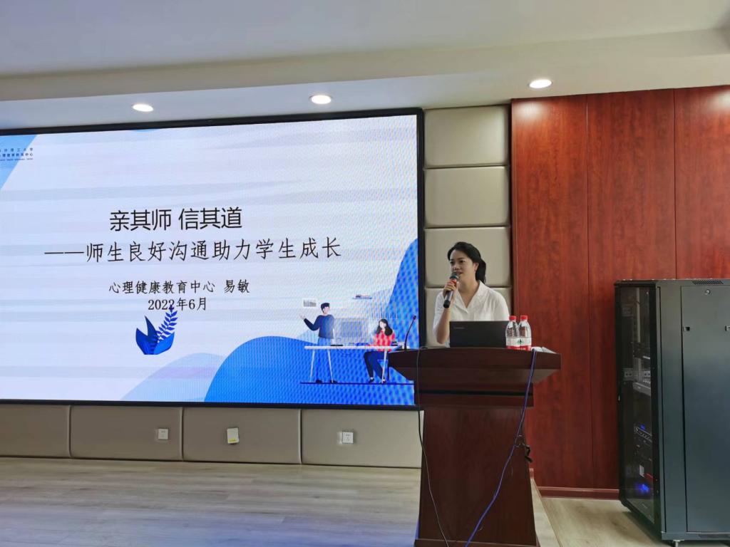 此次培训的主要内容是《亲其师、信其道--师生良好沟通助力学生成长》。培训伊始,易敏老师从关于“师生沟通”的研究成果出发,介绍了当前师生沟通问题的现状,指出学生很注重对“老师的感觉”,往往是先喜欢老师,才喜欢老师给出的教育;而后,通过针对食品学院本科生开展的师生关系问卷调查结果和研究生访谈个案,指出了目前学院师生沟通中存在的“学生对老师满意度高,但学生主动沟通意愿度低的特点”,建议老师们要继续主动加强和学生们的沟通的同时,要注意提升沟通能力,尝试建立“理解性师生关系”。