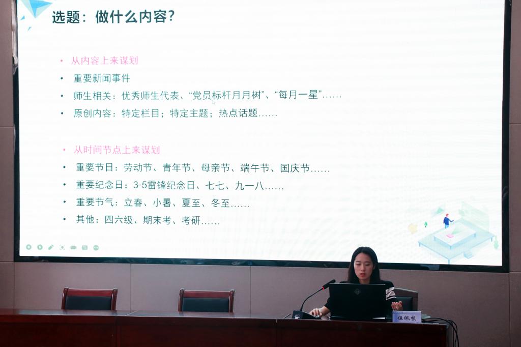 伍佩桢从微信公众号制作的时效性、典型性、真实性、原创性展开课程,详细讲解了微推内容的选题、制作形式、标题编辑等,同时也指出公众号运营存在活跃度低、过度娱乐化等问题。刘飘逸主要对校园消息稿的含义、写作要点、常见误区等进行讲述,用具体实例来说明校园竞赛稿、会议稿以及活动稿的写作方法和要求,并希望学生干部能够以严谨、细心的工作态度去撰写新闻稿。李泰儒从内容选材,角度选择,运镜形式讲授了校园短视频的制作方法,他强调要学会抓住大众的心理,把最精彩的片段放在视频的开端,才能够获得更多的播放量与点赞数,达到宣传的最佳效果。
