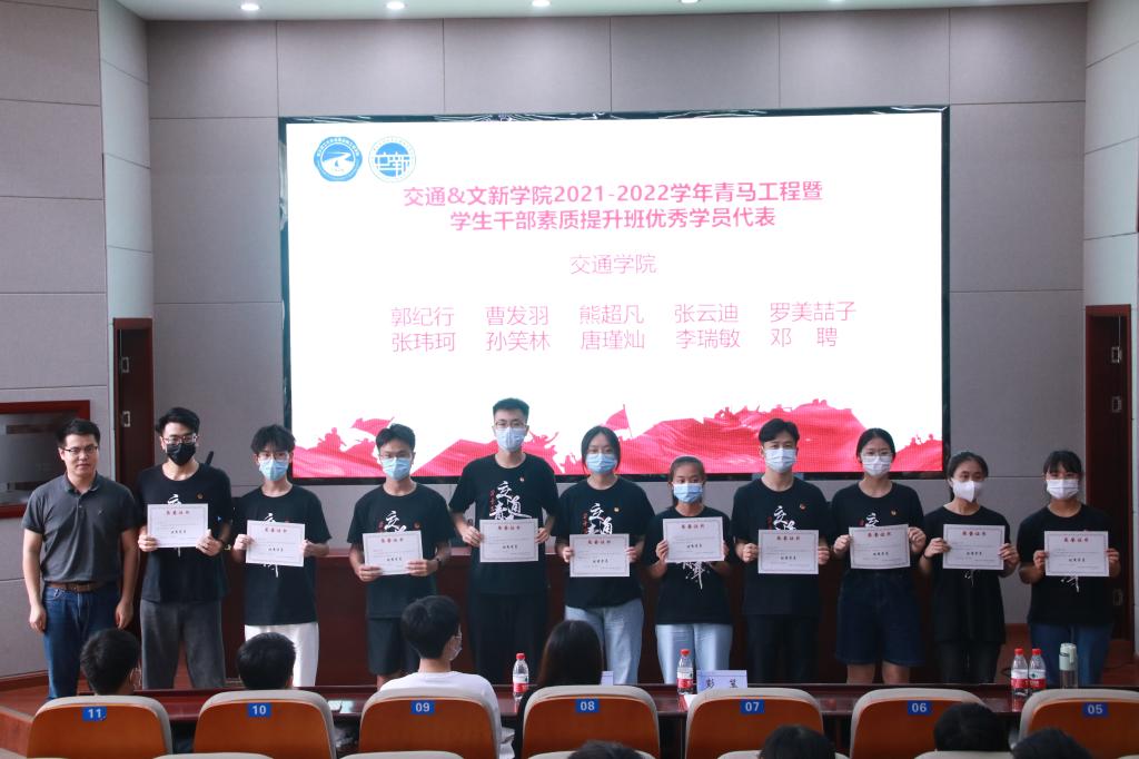 在结业仪式上,全体青马班成员起立合唱团歌。李敏和彭笠分别为文新学院和交通学院中态度认真、学习刻苦的优秀学员进行颁奖并合影留念。