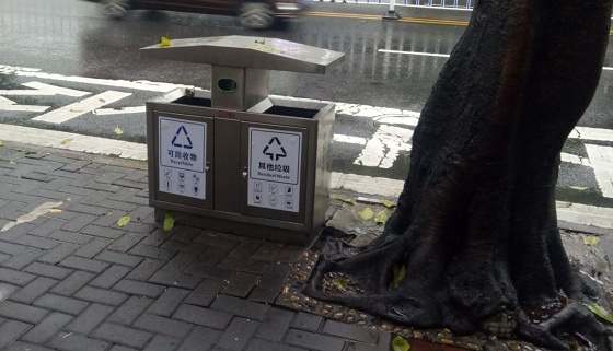 一组团队成员前往广东省江门市海伦堡林荫彼岸社区及周边街道调研。目前社区及街道垃圾箱站点只设置了可回收垃圾、其他垃圾两类垃圾箱。抽样观察垃圾箱内废弃物,发现垃圾箱内各种废弃物混杂,可见很多市民还未形成垃圾分类意识。不过从社区公告可知垃圾分类处理形式和执行方式正在筹划当中,预计一年内将会实行比较全面的垃圾分类。