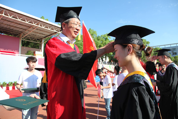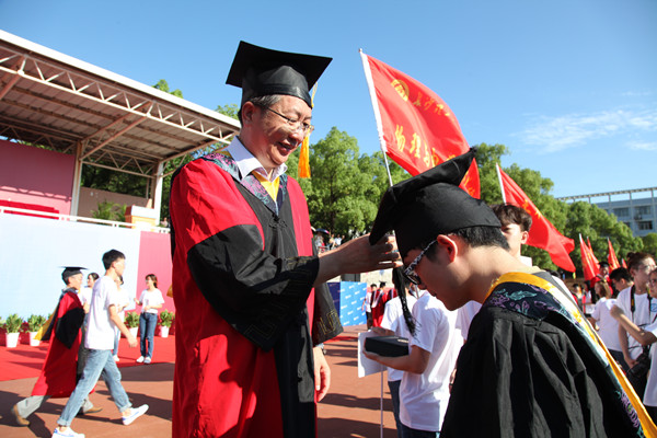 致辞结束后,举行了学位授予仪式。校领导和导师代表们为毕业生一一颁发毕业证书,并为他们正冠拨穗,学生行谢师礼。