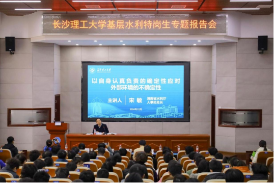 12月24日下午,学校在工科二号楼B301举行基层水利特岗生专题报告会,湖南省水利厅人事处处长宋敏受邀作专题报告。水利学院院长陈杰主持报告会,学院教师和辅导员代表、全体水利特岗生等200余人现场聆听报告。
