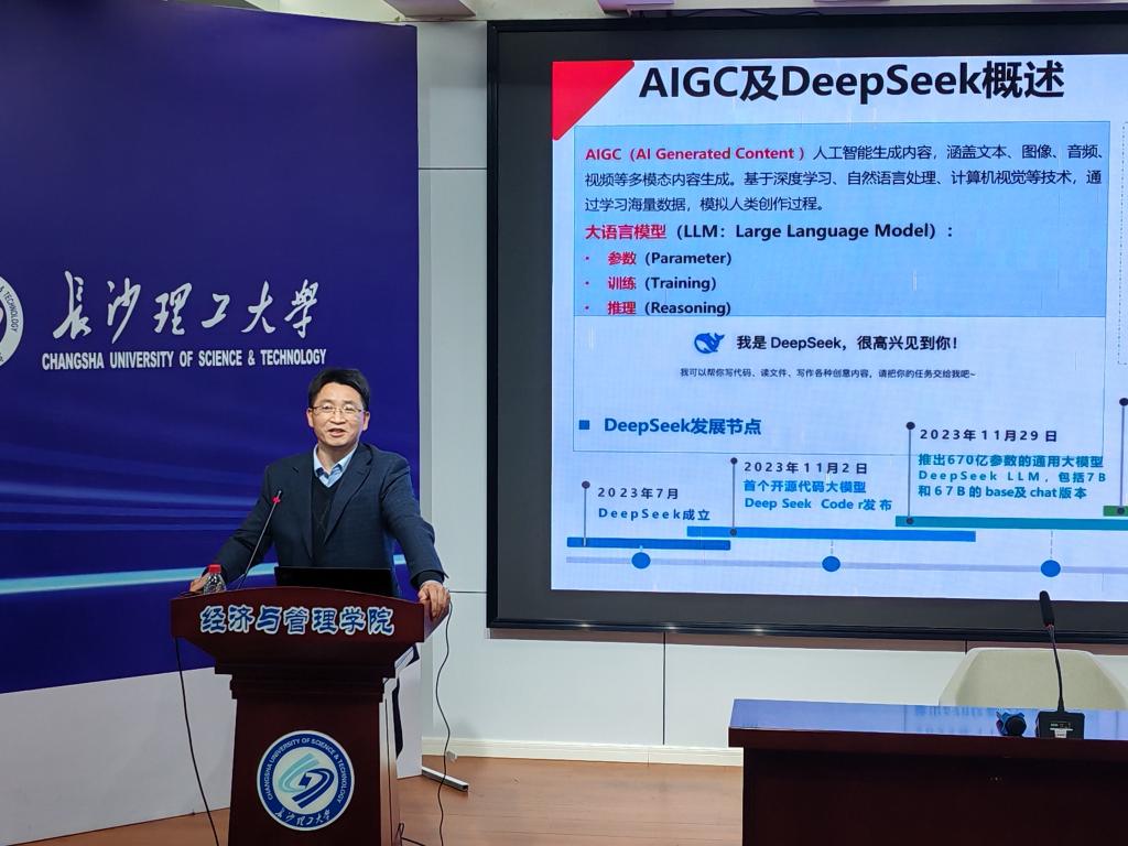 会议最后,数经系曾小青教授为全院教职工带来了一场关于《拥抱AI—用Deepseek赋能新商科教育》的精彩讲座。曾小青重点介绍了常用AI工具以及AI提示语设计的常见误区和解决方法,结合经管领域的应用范例,展示了该工具在学院学术研究、教学方法改进、教学文档准备中的实际成效,并介绍如何从本地部署、Agent等方面深化Deepseek的应用探索,为大家今后更好地利用人工智能技术解决实际问题提供了思路和借鉴。