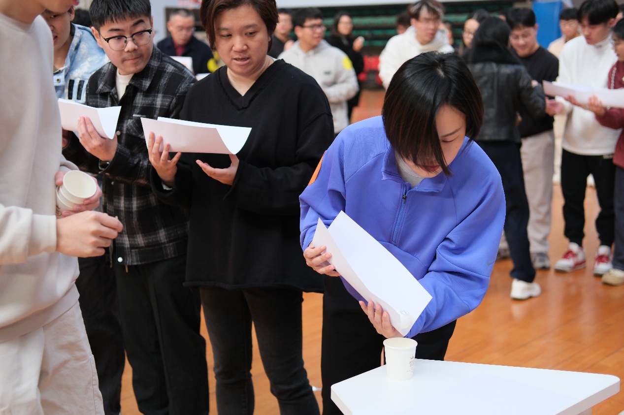 随着比赛正式开始,师生随机组成六支队伍展开角逐。运动会设置四个集体项目,兼顾个人技能与团队协作。“十人十一足”游戏中,队员们肩并肩、腿绑腿,喊着整齐的口号迈向终点,步伐从凌乱到统一的过程生动诠释了团队磨合与信任建立。“珠传万里”则要求队员们利用U型槽接力传递小球,每一次小心翼翼的传递和接应都是耐心与精准配合的体现。“夹波珠”项目聚焦手眼协调与心态稳定,现场不时响起鼓励的掌声。压轴项目“拔河”将现场气氛推向高潮,绳索两端的师生们重心后压、齐心协力,现场观众的呐喊助威声震彻场馆,凝聚力和团队精神充分彰显。