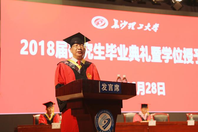 盛夏六月,惠风和畅,云影湖畔,栀子飘香。6月28日下午,2018届研究生毕业典礼暨学位授予仪式在云塘校区大会堂举行,18名毕业博士生、871名毕业研究生圆满完成学业,踏上新的征程。校党委书记付宏渊,副书记邹宏如,副校长黄立宏,校纪委书记胡永乐,副校长蒋昌波、刘扬,学校有关部门和各学院的党政领导、导师代表和家长代表出席活动,副校长叶泽主持毕业典礼。