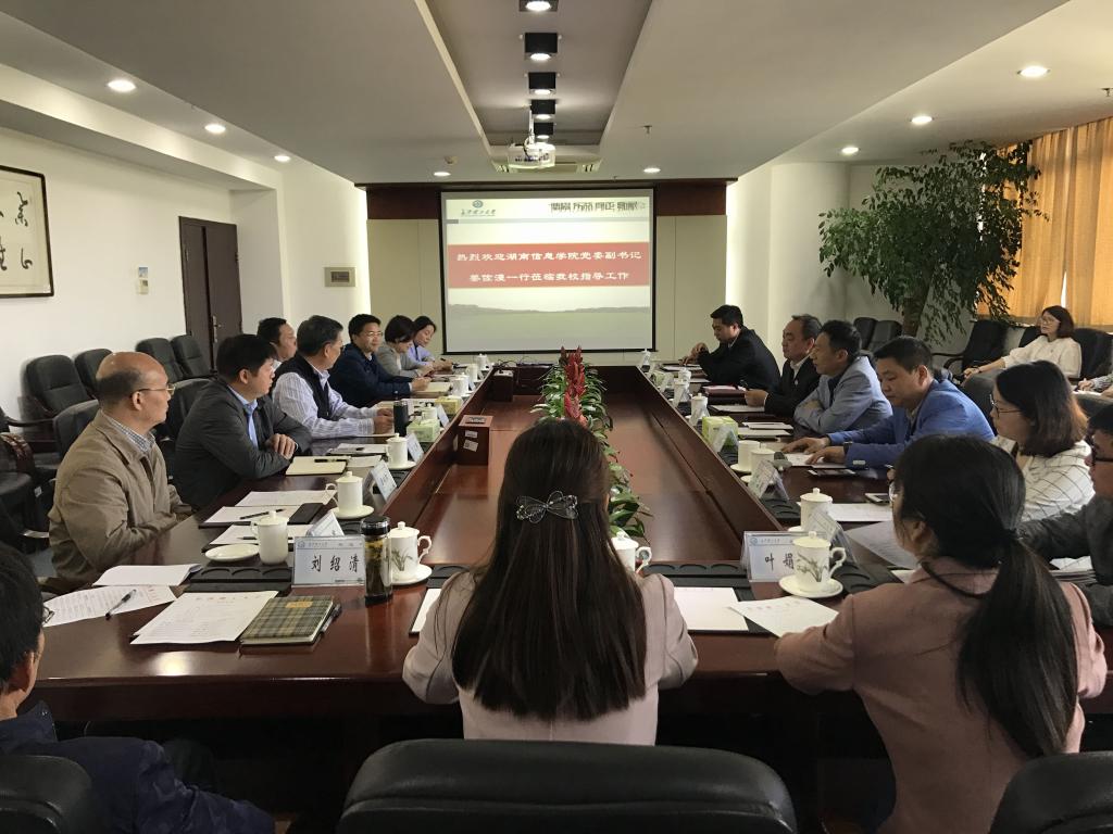 4月18日上午,湖南信息学院党委副书记姜佐醴一行15人来校调研。XK星空副校长谈传生,组织部部长齐路良、招生就业处处长方文彬、校团委书记陈曦、学工部副部长霍向阳、心理中心副主任龚勋、创新创业学院副院长杨建军、电气学院副书记丁丹出席了调研座谈会。座谈会由谈传生主持。
