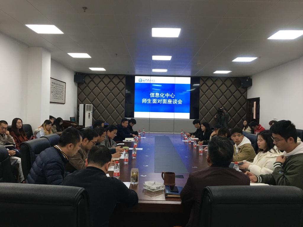 11月6日下午,信息化中心于图书馆911室召开关于校园信息化“师生面对面”座谈会。本次座谈会邀请了校学生会主席及学生会权益部干部和同学代表共30余人。信息化中心主任陈赟、副主任王朗、高捷,中心科级干部及相关技术人员出席了本次座谈会。座谈会由高捷主持。