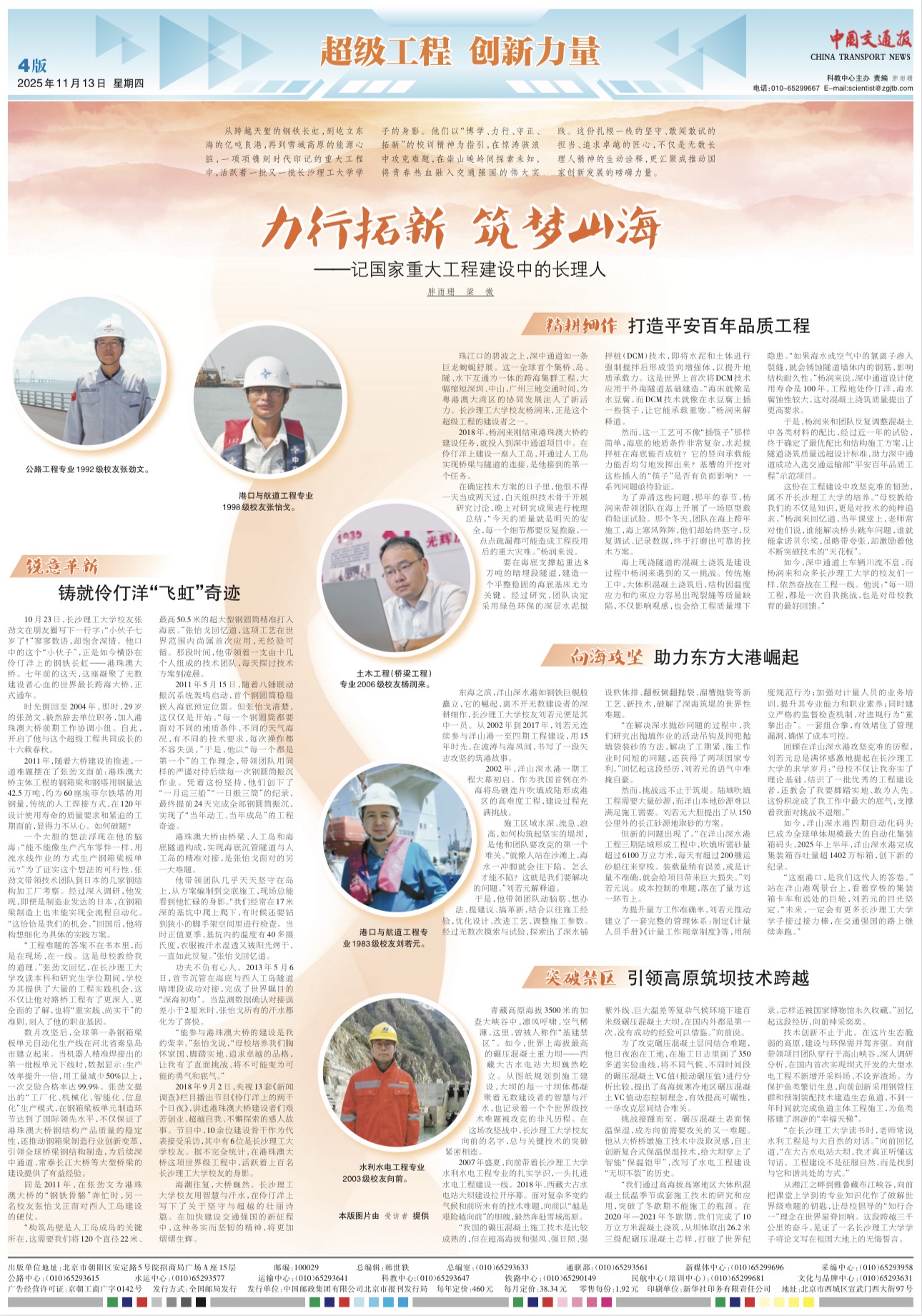 11月13日,《中国交通报》整版刊发报道《力行拓新 筑梦山海——记国家重大工程建设中的长理人》,生动呈现了长理人坚持扎根工程一线、为推动国家创新发展作出卓越贡献的奋斗身影。