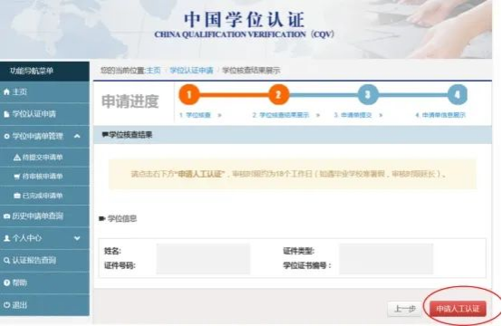 2008年之前获得学位的,需申请人工认证。进入“申请人工认证”界面,完善申请信息后提交。