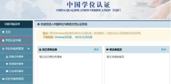3.进入页面,选择左侧“学位认证申请”