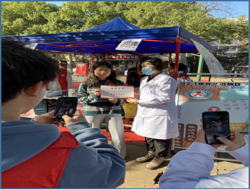 校医院的医生现场给不了解艾滋病相关知识的同学普及相关知识,并为防艾知识线上答题活动的优秀参赛选手颁发荣誉证书。