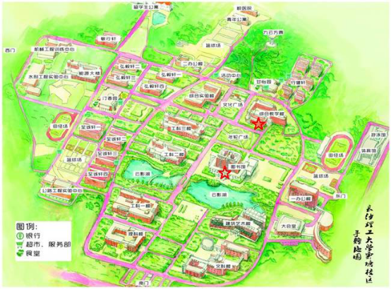 云塘校区手绘地图(标红色五角星位置为综合教学楼和图书馆)