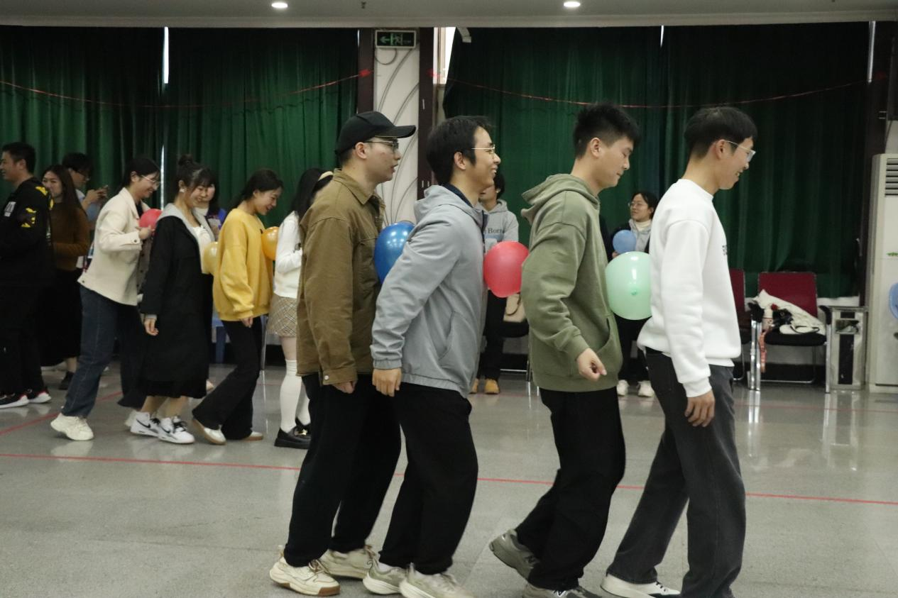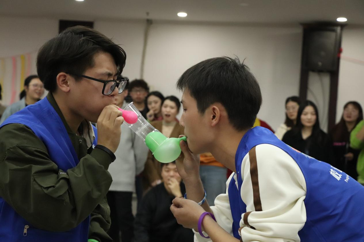 接下来,成员们根据开场前抽到的手环颜色开始组队成团,并在主持人的引导下开始相互熟悉,培养默契。游戏环节设置了气球传杯、直线行走、多足接力、气球蜈蚣等四个项目,兼具娱乐性和协作性,不仅培养了成员们团结合作的能力,帮助成员们在游戏中收获快乐,也便于成员们进一步深入了解彼此,拉近团队距离。进入中场休息阶段,袁子淳、贾芷怡以及周栋、朱志强、陈钰川分别给大家带来了双人舞和歌曲串烧,将现场的气氛再次推向高潮。全部游戏结束后主席团成员为各小组颁发了竞赛礼品,并进行了全场合影。