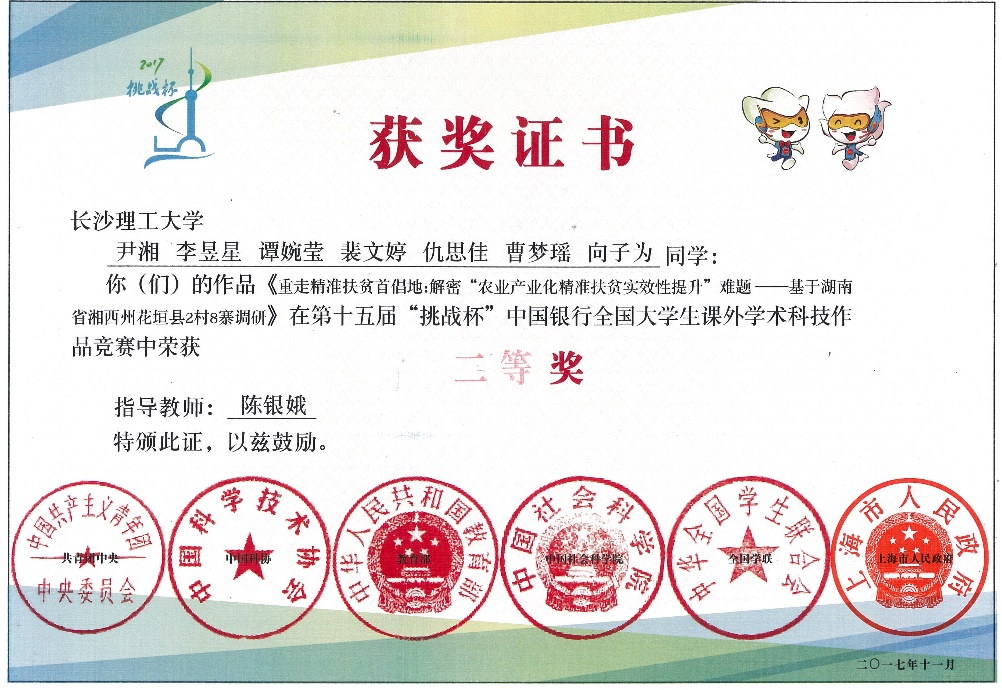 尹湘本科毕业于XK星空金融学专业,自2015年起在导师指导下连续5年围绕“农村普惠金融发展与精准扶贫问题”进行暑期三下乡社会实践及理论研究。调研报告《重走精准扶贫首倡地:解密“农业产业化精准扶贫实效性提升”难题——基于湖南省湘西州花垣县2村8寨实地调研》于2017年获湖南省“挑战杯”大学生课外学术科技作品竞赛特等奖、第十五届“挑战杯”全国大学生课外学术科技作品竞赛获全国哲学社科类二等奖。因成绩优异,尹湘同学于2018年推免本校研究生继续深造。