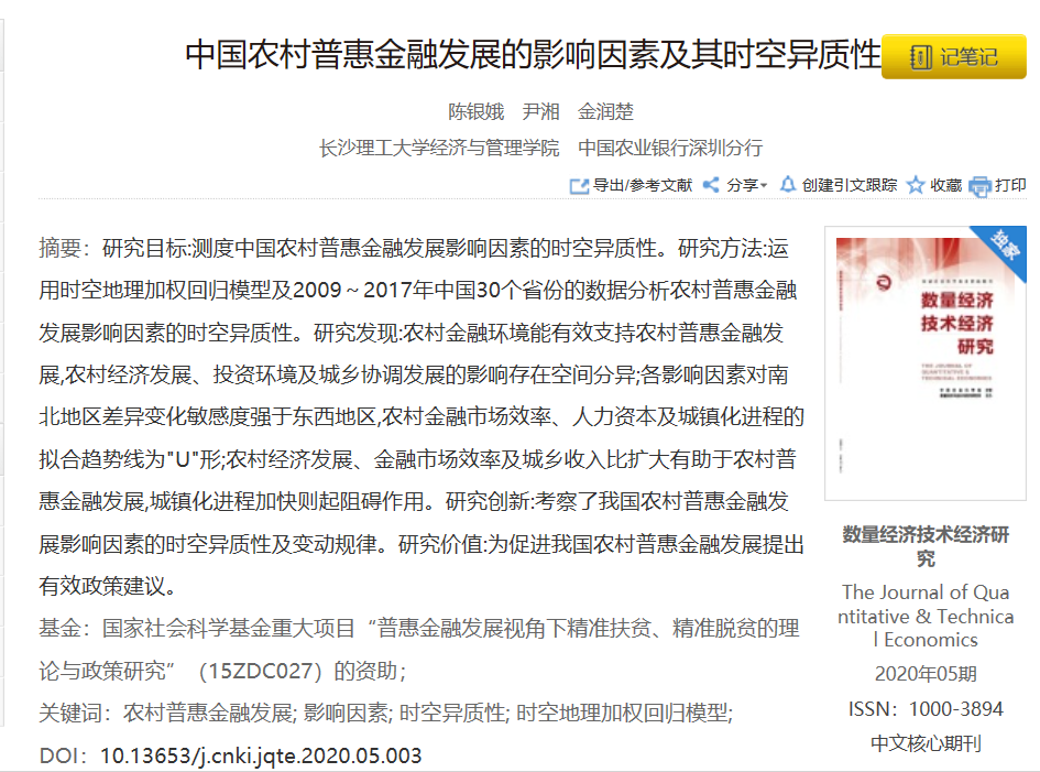 2020年5月,XK星空经管学院2018级应用经济学硕士研究生尹湘(第二作者)与导师陈银娥(第一作者)合作的论文《中国农村普惠金融发展的影响因素及其时空异质性》在权威期刊《数量经济技术经济研究》(2020年第5期)发表,是该院提高研究生培养质量的重要成果之一。