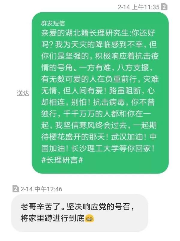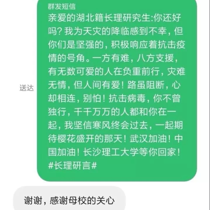 “谢谢,待春暖花开,欢迎来湖北,赏樱花,吃热干面,逛荆州古城,游三峡人家。”XK星空湖北籍研究生姚同学回复了一条特殊的短信,而他收到的这条短信是不知名的研究生同学发来的祝福。与此同时,长理247名湖北籍研究生也都在近期收了这样特别慰问短信。