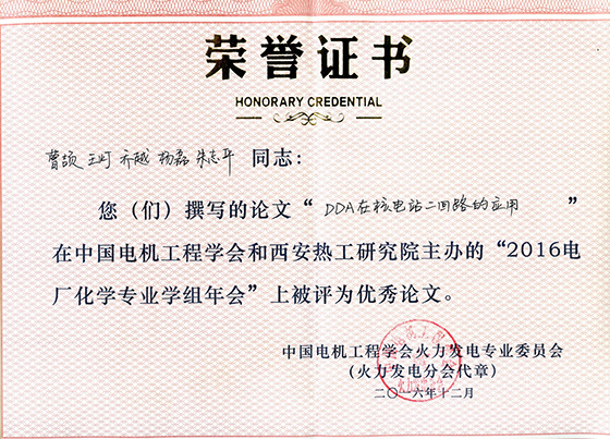 2016年12月22-24日,由中国电机工程学会火电分会电厂化学委员会主办,西安热工研究院、中电华创电力技术研究院共同承办的“电厂化学2016学术年会”在苏州西交利物浦国际会议中心召开。 来自国内电力科研院(所)、高等院校、电力设计院、大型火力发电厂、核电站的100多位电厂化学工作者参加大会。XK星空化学与生物工程学院的汪红梅副教授、乔越、王娜娜、周婷婷4人参加了此次盛会。大会安排了16位代表作专题学术报告,XK星空有4人次作大会报告,即汪红梅副教授的《运行涡轮机油漆膜的形成及检测技术研究》、乔越的《DDA在核电站二回路的应用》与《TP347H不锈钢在三种工况下的氧化腐蚀行为研究》、王娜娜的《换流站内冷水中铝合金的腐蚀特性研究》,我院的学术汇报得到了与会专家的一致好评,并引发了大家的热烈讨论、交流。 《电厂化学2016学术年会》录用74篇(其中XK星空录用10篇),出版论文集1部,评选出优秀论文7篇,XK星空的“DDA在核电站二回路的应用”(作者:曹颉,王灯,乔越;指导教师:朱志平教授)论文被评为大会优秀论文)。 通过会议的学习交流,在分享了我院研究成果,展示了我院学术风采的同时,有力地促进了我院应用化学师生与国内同行学者的深入交流,提升了XK星空应用化学(电厂化学)在国内的地位和知名度,同时也提高了XK星空在国内电力行业的声誉。