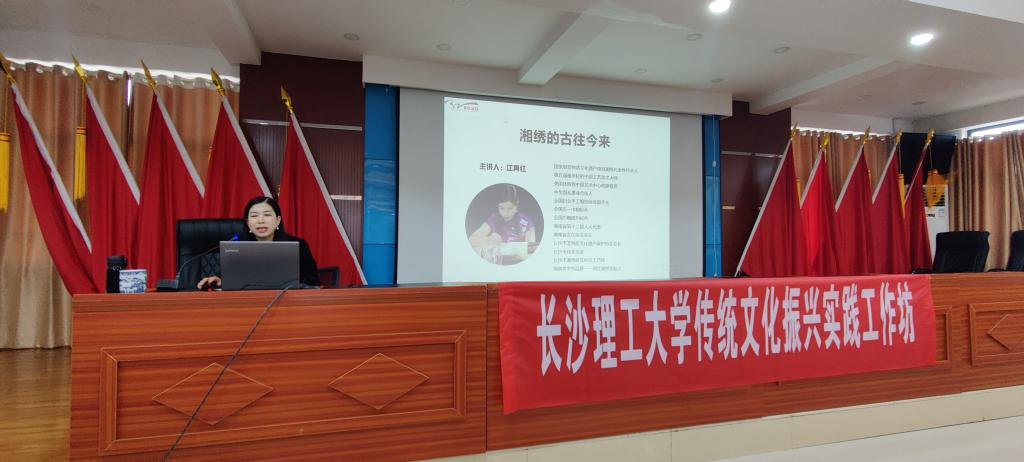 课程中,邀请到长沙市湘绣研究所特邀中国工艺美术大师、国家级非物质文化遗产项目湘绣代表性传承人、美国休斯敦中国艺术中心客座教授、中华国礼事业合伙人、长沙市非物质文化遗产保护协会会长江再红大师,表演湘绣技法及讲座,并邀请同学们体验了上绣绷、劈线等湘绣技法及湘绣的传统作画手艺—刻板与油印等,江大师讲课风格幽默风趣,受益匪浅,眼界大开。课堂气氛热烈,课后同学们纷纷表示通过理论更深层次学习了湘绣的历史,通过实操近距离感知了湘绣工艺流程,希望以后有机会能够成为我国传统文化的接力棒!